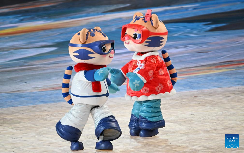 Mascots are seen during the opening ceremony of the 9th Asian Winter Games in Harbin, northeast China's Heilongjiang Province, Feb. 7, 2025. (Xinhua/Chen Zhenhai)