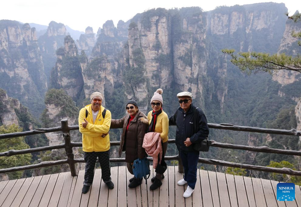 Tourists from Thailand pose for a photo at Zhangjiajie National Forest Park in central China's Hunan Province, Feb. 15, 2025.