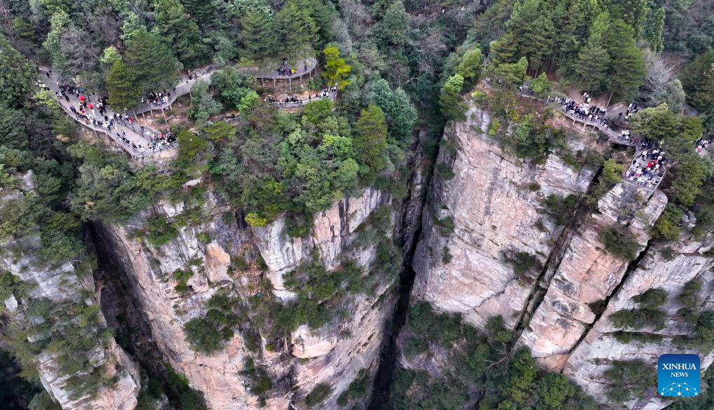 In this aerial drone photo, tourists visit Zhangjiajie National Forest Park in central China's Hunan Province, Feb. 5, 2025.