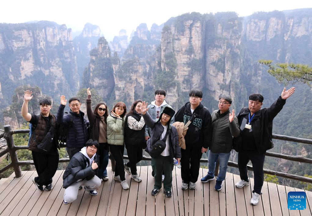 Tourists from South Korea pose for a photo at Zhangjiajie National Forest Park in central China's Hunan Province, Feb. 15, 2025.