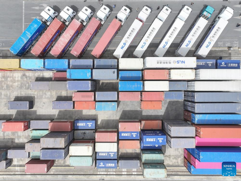 An aerial drone photo taken on April 14, 2025 shows hydrogen-powered heavy-duty trucks awaiting departure from the dry port of the New International Land-Sea Trade Corridor in Chongqing, southwest China. China's first cross-region hydrogen heavy-duty truck route was launched on Monday, marking a milestone in terms of advancing hydrogen energy development in China's western regions.