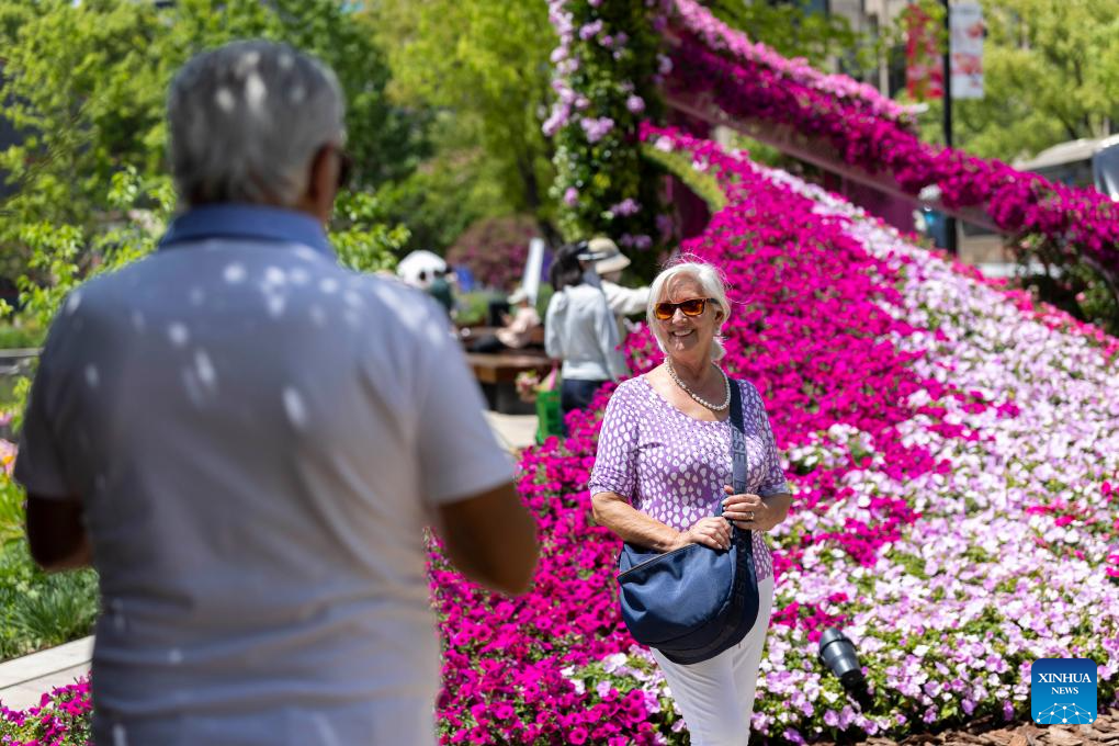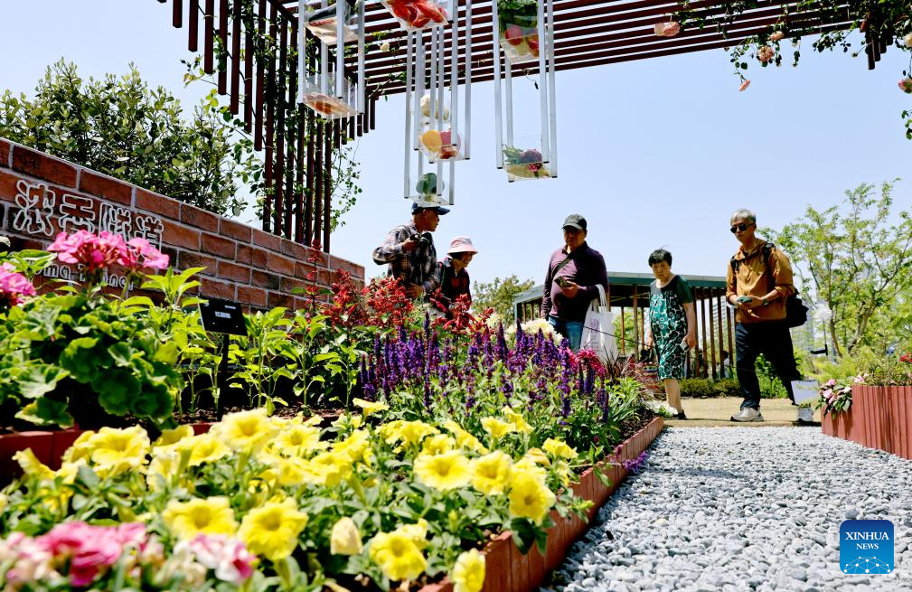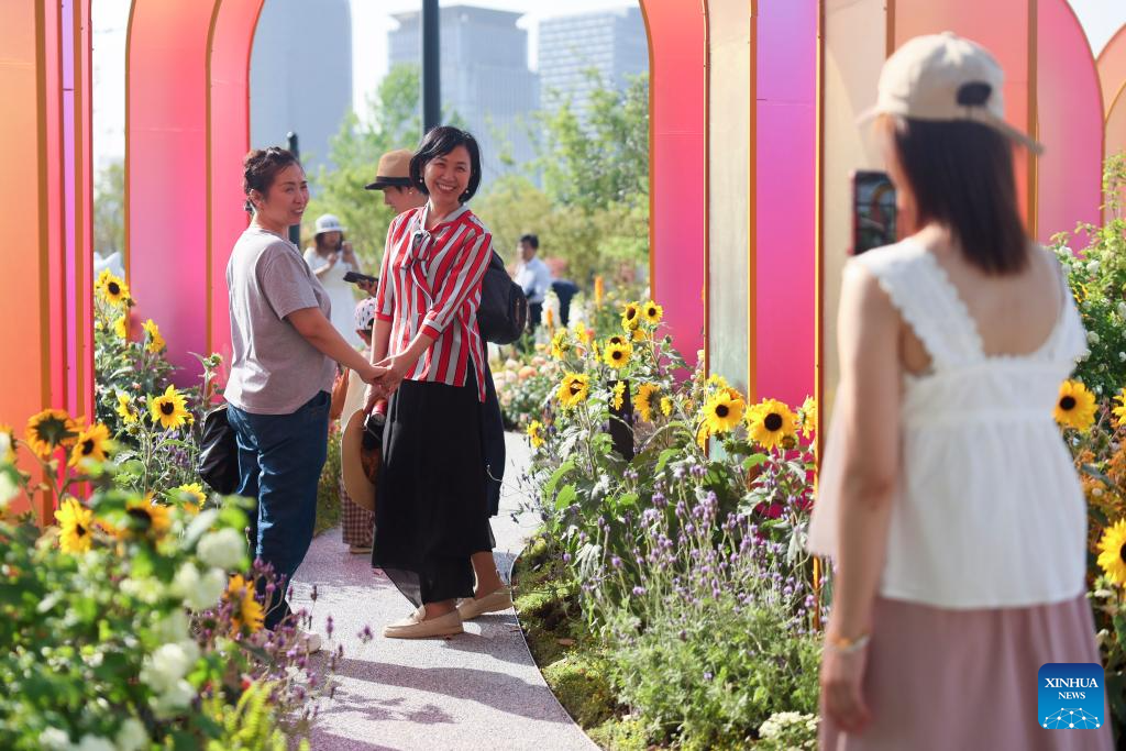 People enjoy themselves at a venue of the 2025 Shanghai International Flower Show in Huangpu District of east China's Shanghai, April 18, 2025. The 2025 Shanghai International Flower Show opened on Friday with two main venues, five sub-venues and 15 exhibition spots across the city. (Xinhua/Wang Xiang)