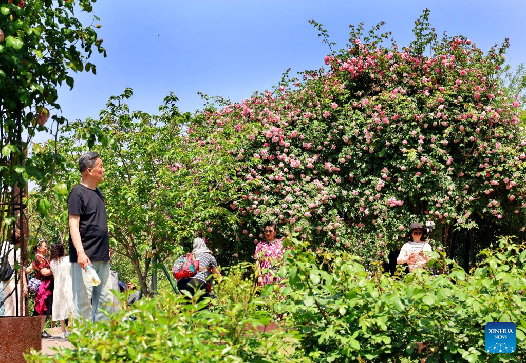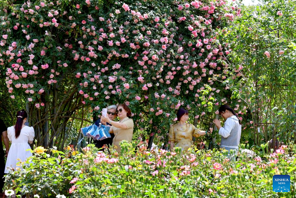 People take photos with Chinese roses at Shanghai Botanical Garden in east China's Shanghai, April 18, 2025. The 2025 Shanghai International Flower Show opened on Friday with two main venues, five sub-venues and 15 exhibition spots across the city. (Xinhua/Fang Zhe)