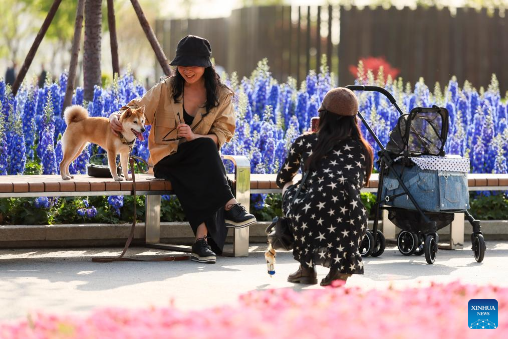 A woman poses for photos with a pet dog in front of flowers at a sub-venue of the 2025 Shanghai International Flower Show in Huangpu District of east China's Shanghai, April 18, 2025. The 2025 Shanghai International Flower Show opened on Friday with two main venues, five sub-venues and 15 exhibition spots across the city. (Xinhua/Wang Xiang)