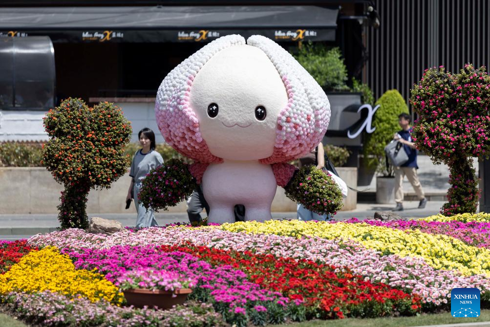 People walk past the mascot of the 2025 Shanghai International Flower Show at a venue of the show in Huangpu District of east China's Shanghai, April 18, 2025. The 2025 Shanghai International Flower Show opened on Friday with two main venues, five sub-venues and 15 exhibition spots across the city. (Xinhua/Wang Xiang)