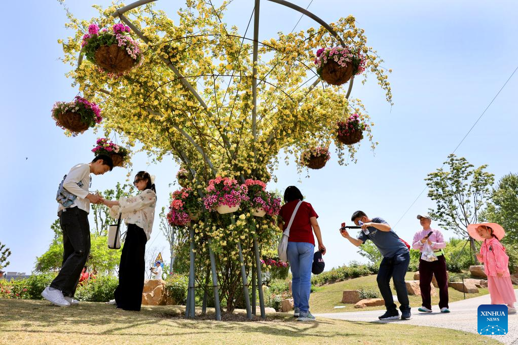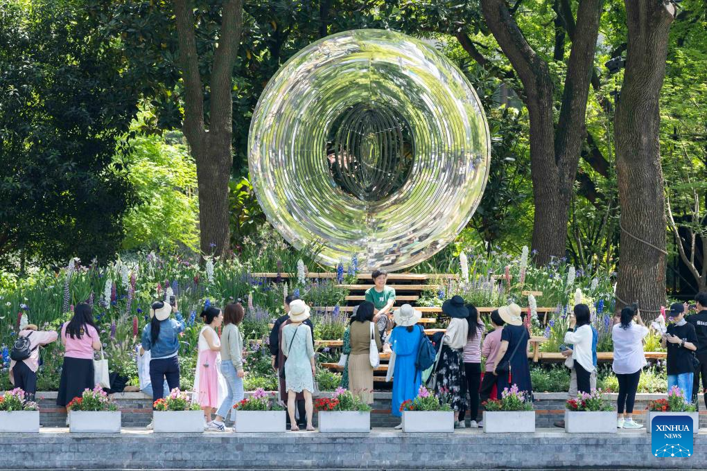 People view an installation decorated with flowers at Shanghai Botanical Garden in east China's Shanghai, April 18, 2025. The 2025 Shanghai International Flower Show opened on Friday with two main venues, five sub-venues and 15 exhibition spots across the city. (Xinhua/Fang Zhe)