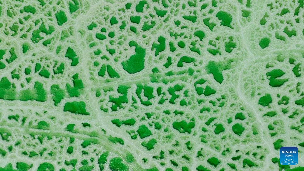 An aerial drone photo taken on April 19, 2025 shows the Jade Lake in Mangya, Haixi Mongolian and Tibetan Autonomous Prefecture of northwest China's Qinghai Province. Because of the difference in its depth and the concentration of minerals in the water, the Jade Lake takes on a number of hues, making it a popular scenic spot. (Xinhua/Wang Bo)