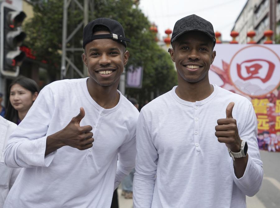 A pair of twins from Chad are pictured during the 19th Mojiang international twins festival in Mojiang Hani Autonomous County, southwest China's Yunnan province, May 1, 2025. (Xinhua/Chen Xinbo)