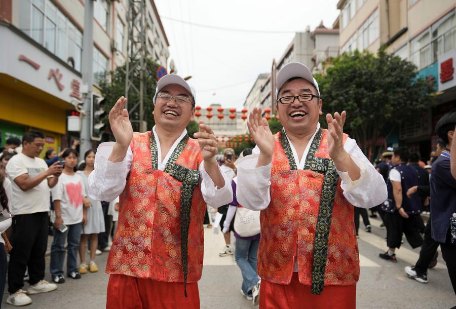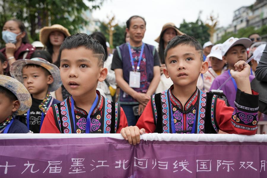 A pair of twins are pictured during the 19th Mojiang international twins festival in Mojiang Hani Autonomous County, southwest China's Yunnan province, May 1, 2025. (Xinhua/Chen Xinbo)