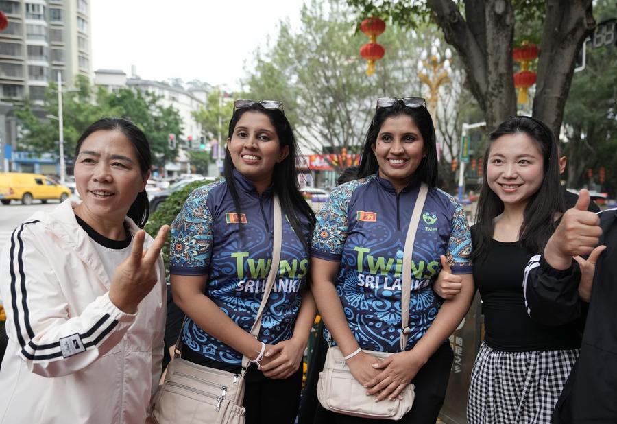 A pair of twins from Sri Lanka pose for group photos with citizens during the 19th Mojiang international twins festival in Mojiang Hani Autonomous County, southwest China's Yunnan province, May 1, 2025. (Xinhua/Chen Xinbo)