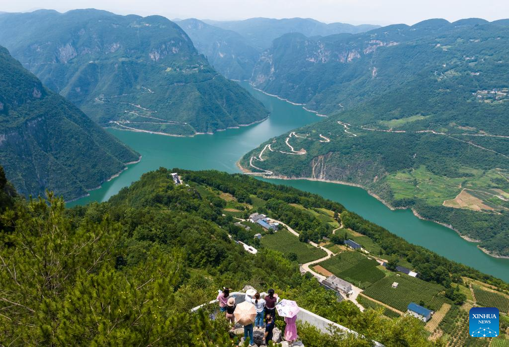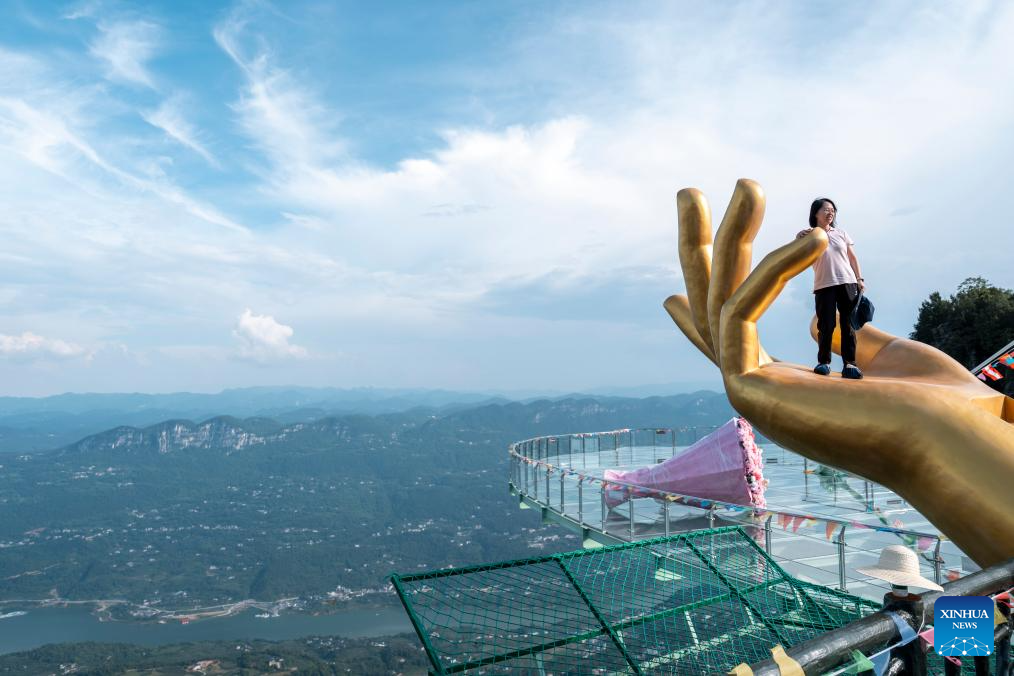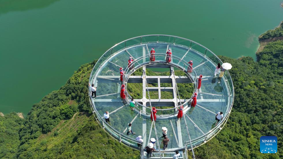 An aerial drone photo taken on July 7, 2025 shows tourists visiting a glass skywalk in Shuibuya Township of Badong County, Enshi Tujia and Miao Autonomous Prefecture, central China's Hubei Province. Enshi is a well-known summer travel destination in central China. Tapping diverse ecological resources, such as unique karst landforms, pleasant alpine climate, and dense primeval forests, the local authorities have actively developed summer tourism, and meticulously created diversified tourism products, like exploring canyon and cave, rafting on Qingjiang River and experiencing the culture of Tujia ethnic group. (Photo by Yang Shunpi/Xinhua)