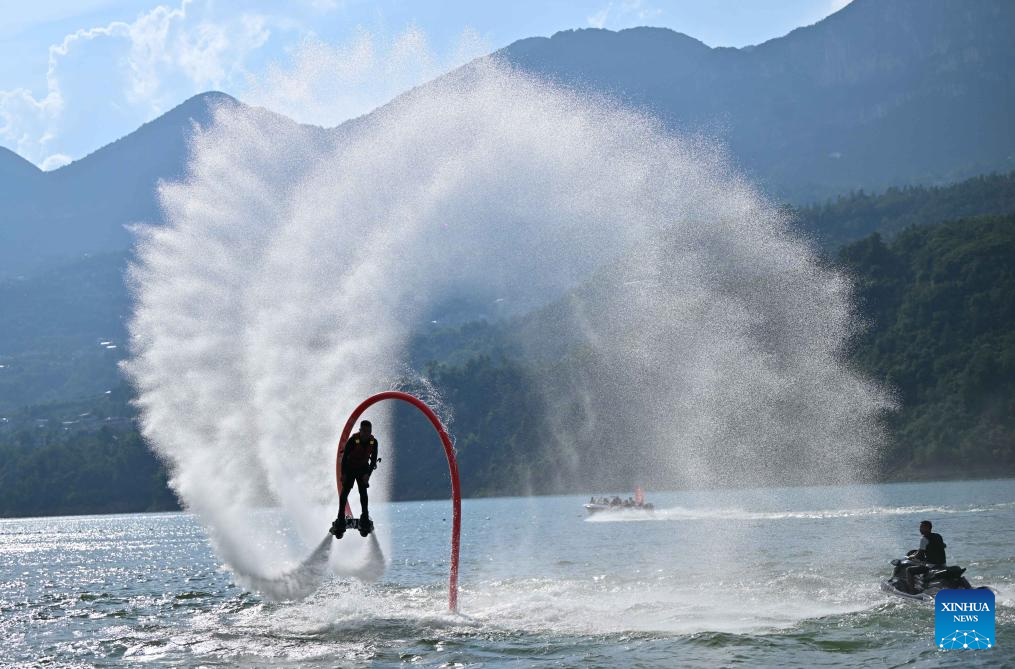 A staff member of the aquatic sports center performs a "Water Flyer" show in Jianshi County, Enshi Tujia and Miao Autonomous Prefecture, central China's Hubei Province, July 7, 2025. Enshi is a well-known summer travel destination in central China. Tapping diverse ecological resources, such as unique karst landforms, pleasant alpine climate, and dense primeval forests, the local authorities have actively developed summer tourism, and meticulously created diversified tourism products, like exploring canyon and cave, rafting on Qingjiang River and experiencing the culture of Tujia ethnic group. (Photo by Song Wen/Xinhua)