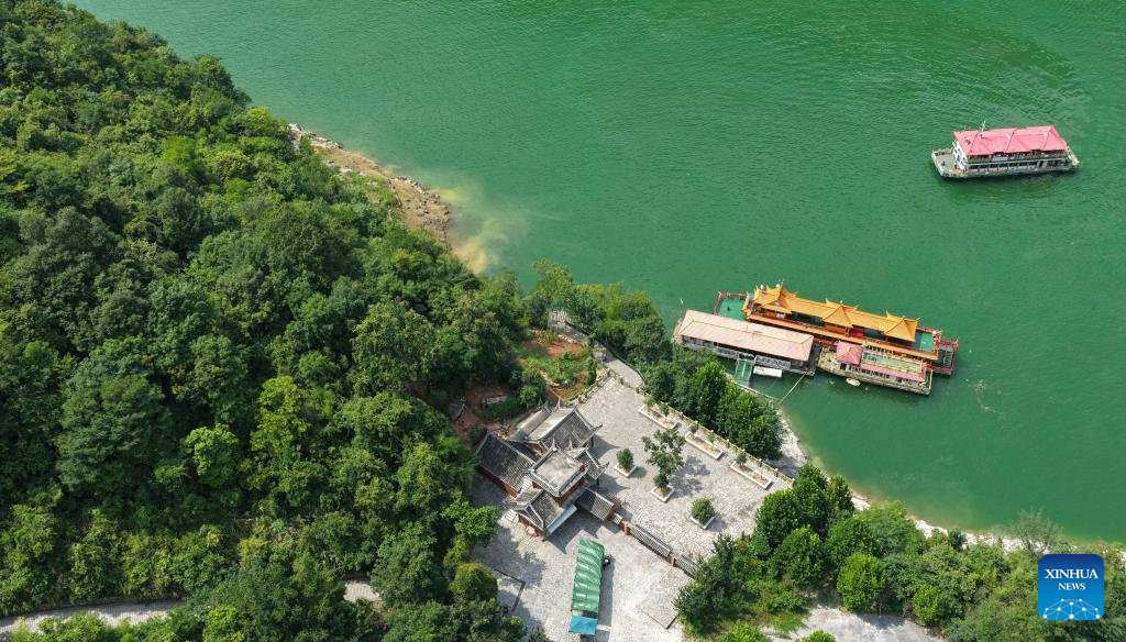An aerial drone photo taken on July 7, 2025 shows tourists taking a boat tour at Hudieyan scenic area in Jianshi County, Enshi Tujia and Miao Autonomous Prefecture, central China's Hubei Province. Enshi is a well-known summer travel destination in central China. Tapping diverse ecological resources, such as unique karst landforms, pleasant alpine climate, and dense primeval forests, the local authorities have actively developed summer tourism, and meticulously created diversified tourism products, like exploring canyon and cave, rafting on Qingjiang River and experiencing the culture of Tujia ethnic group. (Photo by Yang Shunpi/Xinhua)