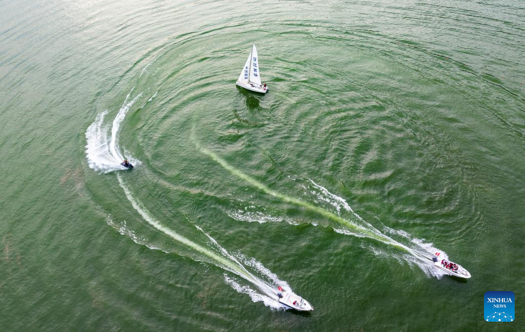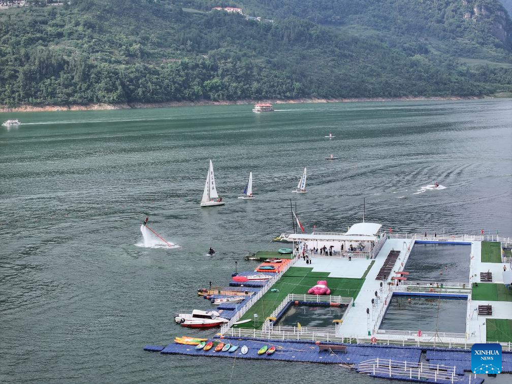 An aerial drone photo taken on July 7, 2025 shows tourists experiencing water sports activities at an aquatic sports center in Jianshi County, Enshi Tujia and Miao Autonomous Prefecture, central China's Hubei Province. Enshi is a well-known summer travel destination in central China. Tapping diverse ecological resources, such as unique karst landforms, pleasant alpine climate, and dense primeval forests, the local authorities have actively developed summer tourism, and meticulously created diversified tourism products, like exploring canyon and cave, rafting on Qingjiang River and experiencing the culture of Tujia ethnic group. (Photo by Zhao Jun/Xinhua)