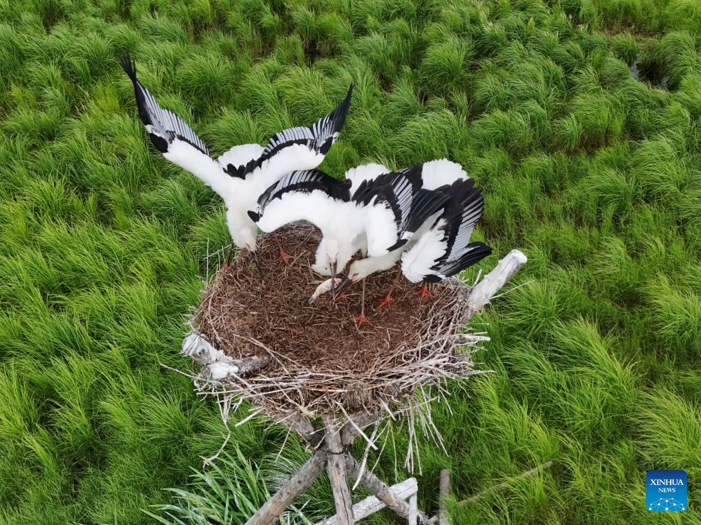 A drone photo taken on July 13, 2025 shows oriental white storks at Sanhuanpao National Nature Reserve, in Fujin City, northeast China's Heilongjiang Province. Midsummer is the typical fledging season for oriental white stork chicks, which will later leave their parents.