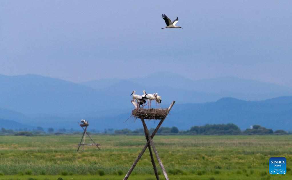 A drone photo taken on July 13, 2025 shows oriental white storks in an artificial nest at Sanhuanpao National Nature Reserve, in Fujin City, northeast China's Heilongjiang Province. Midsummer is the typical fledging season for oriental white stork chicks, which will later leave their parents.