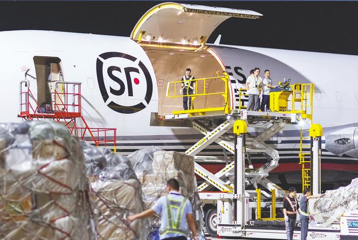 Staff members load the cargo onto an airplane at theEzhou Huahu International Airport in Ezhou, central China's Hubei Province,onJuly 11, 2025. Brightly lit during the night, Ezhou Huahu International Airport, China's first cargo-focused airport, is kept awake handling cargo from home and abroad. Starting operation in July 2022, the airport located in Ezhou, central China's Hubei Province, owning a 750,000-square-meter cargo transfer center with parcel sorting lines adding up to 52 kilometers, is now running 59 domestic cargo routes in addition to 45 international routes. (Photo: Hubei Daily / Ke Hao and Xue Ting)