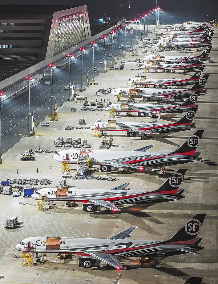 Photo taken on July 11, 2025 shows an interior view of the cargo transfer center at Ezhou Huahu International Airport in Ezhou, central China's Hubei Province. Brightly lit during the night, Ezhou Huahu International Airport, China's first cargo-focused airport, is kept awake handling cargo from home and abroad. Starting operation in July 2022, the airport, owning a 750,000-square meter cargo transfer center with parcel sorting lines adding up to 52 kilometers, is now running 59 domestic cargo routes in addition to 45 international routes.(Photo: Hubei Daily / Ke Hao and Xue Ting)