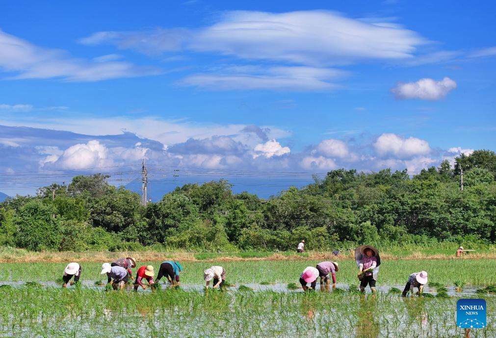 Farmers transplant rice seedlings in Loudi, central China's Hunan Province, July 21, 2025. Farmers across the country are busy with agricultural production in the farming season around Dashu, or the Great Heat, the 12th of traditional Chinese 24 solar terms falling on July 22 this year. (Photo by Li Jianxin/Xinhua)