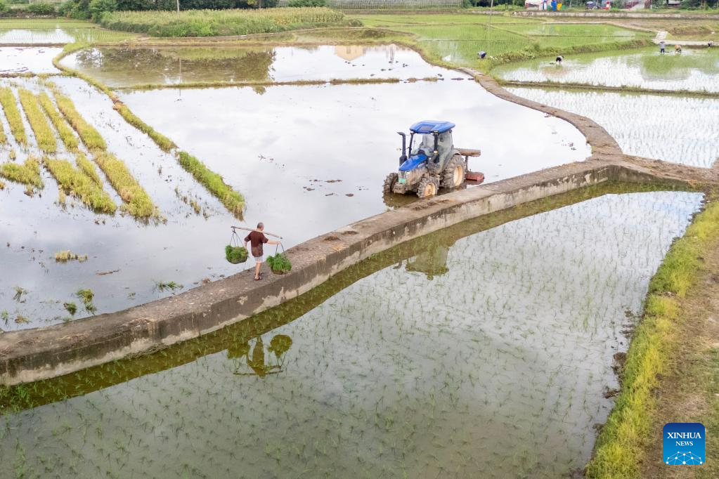 An aerial drone photo taken on July 21, 2025 shows a farmer carrying rice seedlings in Loudi, central China's Hunan Province. Farmers across the country are busy with agricultural production in the farming season around Dashu, or the Great Heat, the 12th of traditional Chinese 24 solar terms falling on July 22 this year. (Photo by Wu Yonghua/Xinhua)