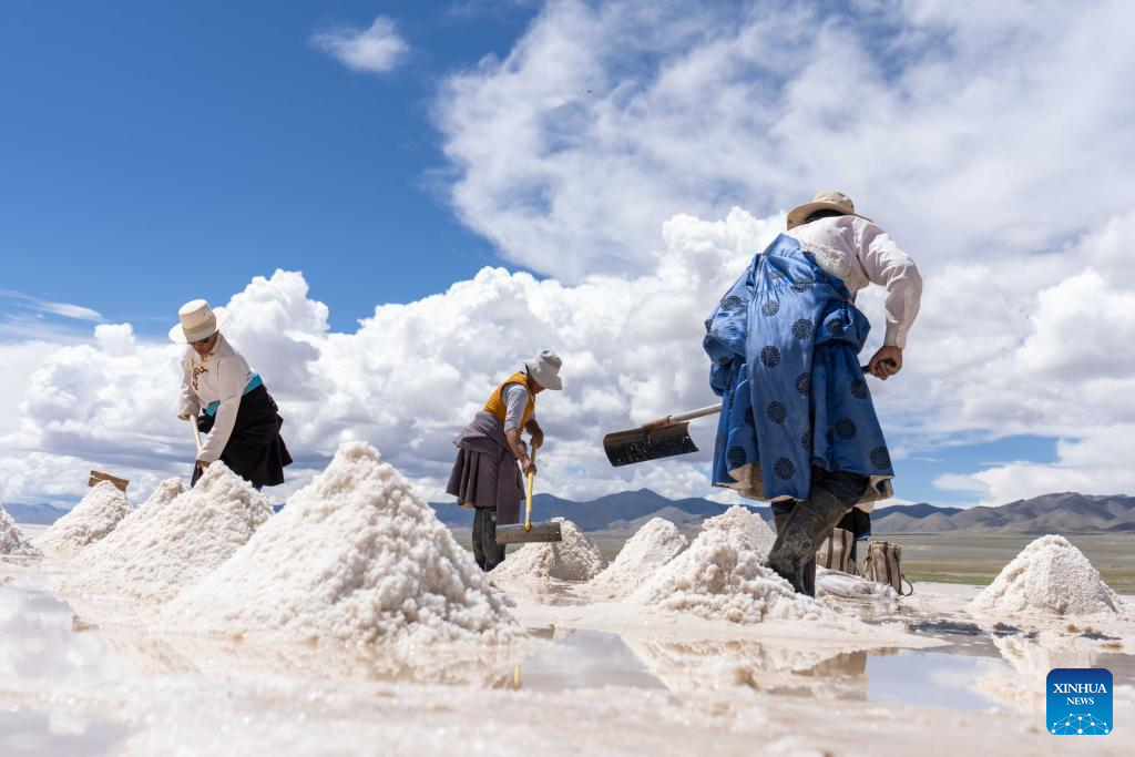 Herdsmen harvest the salt in Gegye County of Ngari Prefecture, southwest China's Xizang Autonomous Region, July 20, 2025. Rich in salt resources, Gegye County has established a crude salt processing plant, and formed gradually an industrial chain integrating salt harvesting, storage, processing, packaging and sales to increase the villagers' income. In 2018, Gegye's salt-carrying custom was included in the representative list of intangible cultural heritage of the Xizang Autonomous Region. (Xinhua/Tenzing Nima Qadhup)