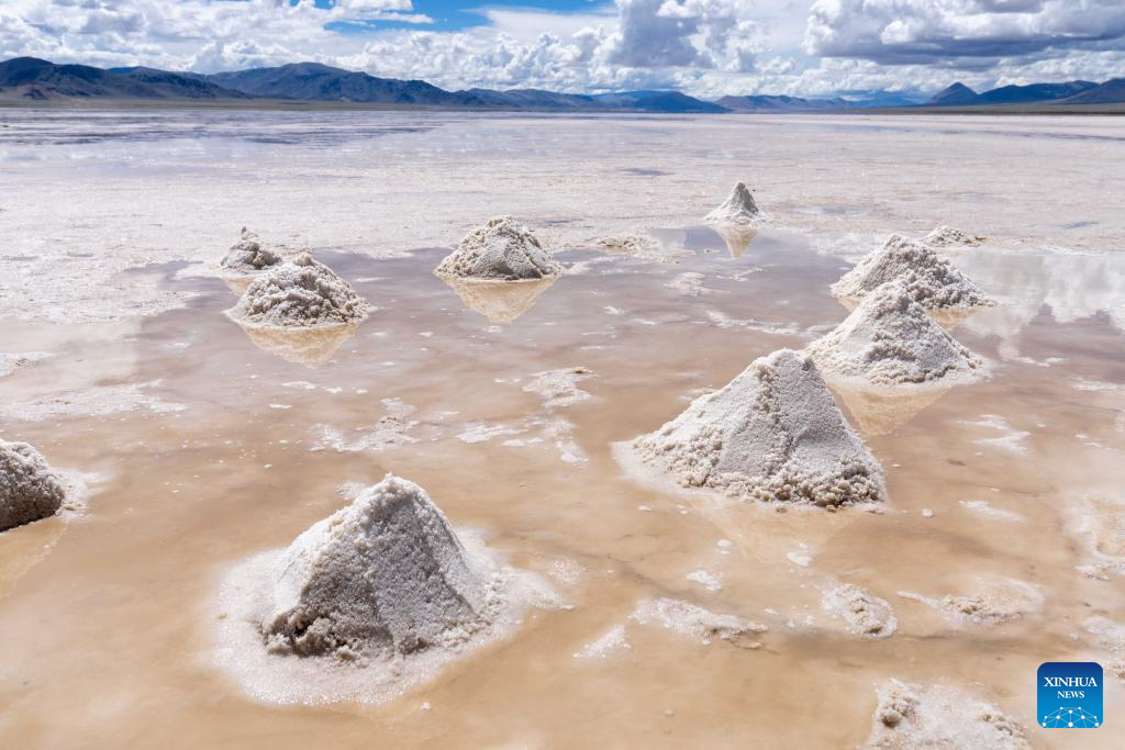This photo taken on July 20, 2025 shows the harvested salt in Gegye County of Ngari Prefecture, southwest China's Xizang Autonomous Region. Rich in salt resources, Gegye County has established a crude salt processing plant, and formed gradually an industrial chain integrating salt harvesting, storage, processing, packaging and sales to increase the villagers' income. In 2018, Gegye's salt-carrying custom was included in the representative list of intangible cultural heritage of the Xizang Autonomous Region. (Xinhua/Tenzing Nima Qadhup)