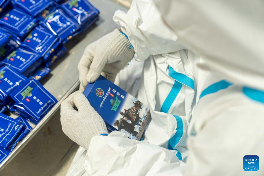 A staff member packages the salt at a crude salt processing plant in Gegye County of Ngari Prefecture, southwest China's Xizang Autonomous Region, July 20, 2025. Rich in salt resources, Gegye County has established a crude salt processing plant, and formed gradually an industrial chain integrating salt harvesting, storage, processing, packaging and sales to increase the villagers' income. In 2018, Gegye's salt-carrying custom was included in the representative list of intangible cultural heritage of the Xizang Autonomous Region. (Xinhua/Tenzing Nima Qadhup)