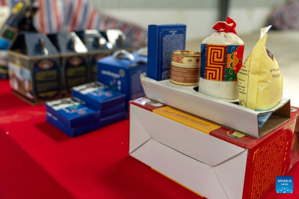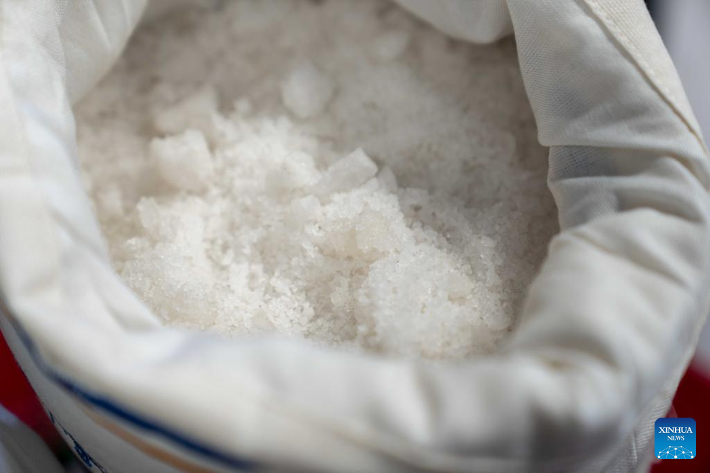 This photo taken on July 20, 2025 shows the products of a crude salt processing plant in Gegye County of Ngari Prefecture, southwest China's Xizang Autonomous Region. Rich in salt resources, Gegye County has established a crude salt processing plant, and formed gradually an industrial chain integrating salt harvesting, storage, processing, packaging and sales to increase the villagers' income. In 2018, Gegye's salt-carrying custom was included in the representative list of intangible cultural heritage of the Xizang Autonomous Region. (Xinhua/Tenzing Nima Qadhup)
