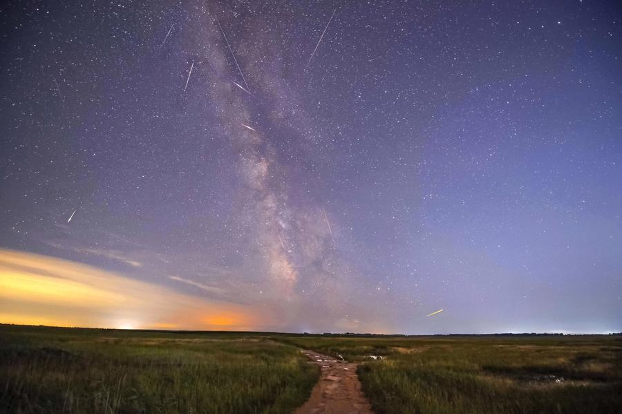A stacked photo taken on July 30, 2025 shows meteor shower at the Zhalong National Nature Reserve in Qiqihar City, northeast China's Heilongjiang Province. (Photo by Wang Yonggang/Xinhua)
