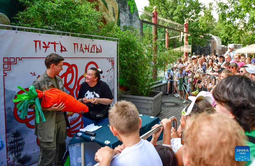 People make a gift for giant panda Ru Yi at the Moscow Zoo in Moscow, Russia on July 31, 2025. The Moscow Zoo held an event to celebrate giant panda Ru Yi's birthday on Thursday. (Xinhua/Zhang Chaoqun)