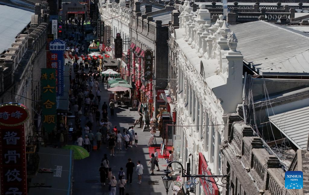 A drone photo taken on July 30, 2025 shows tourists visiting the Central Street in Harbin, northeast China's Heilongjiang Province. While much of China swelters under scorching summer heat, Harbin, capital of northeast China's Heilongjiang Province, is drawing visitors with a refreshing contrast, offering a chilly escape fueled by its pleasantly cool climate.