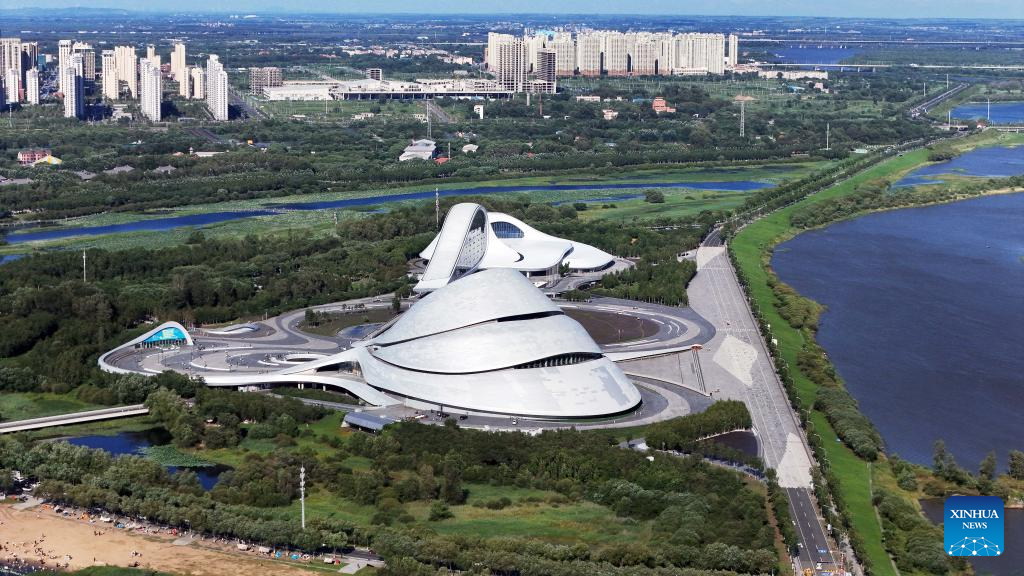 An aerial drone photo taken on July 30, 2025 shows a view of the Harbin Grand Theatre in Harbin, northeast China's Heilongjiang Province. While much of China swelters under scorching summer heat, Harbin, capital of northeast China's Heilongjiang Province, is drawing visitors with a refreshing contrast, offering a chilly escape fueled by its pleasantly cool climate.