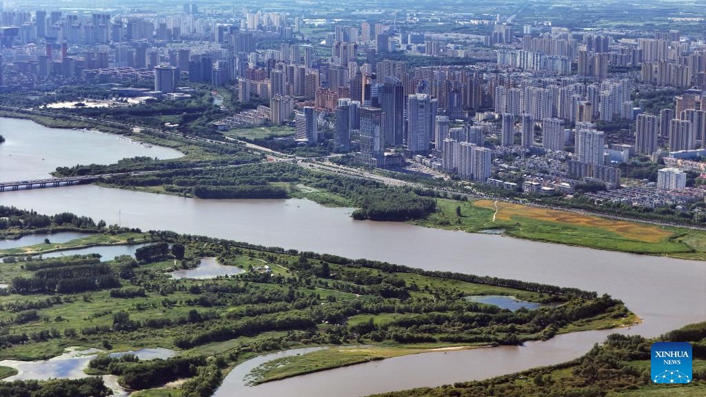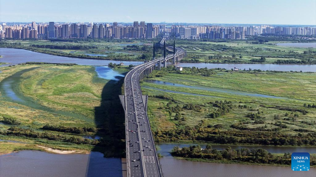 An aerial drone photo taken on July 30, 2025 shows a view of the urban architecture and surrounding wetland landscape in Harbin, northeast China's Heilongjiang Province. While much of China swelters under scorching summer heat, Harbin, capital of northeast China's Heilongjiang Province, is drawing visitors with a refreshing contrast, offering a chilly escape fueled by its pleasantly cool climate.