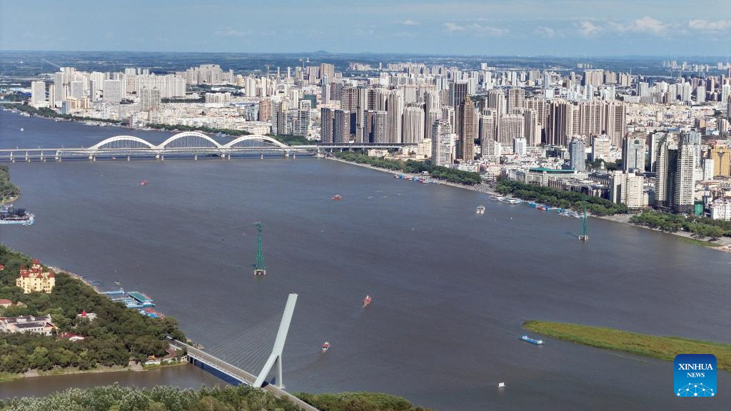 An aerial drone photo taken on July 30, 2025 shows a view of the Songhua River and the urban architecture along the river in Harbin, northeast China's Heilongjiang Province. While much of China swelters under scorching summer heat, Harbin, capital of northeast China's Heilongjiang Province, is drawing visitors with a refreshing contrast, offering a chilly escape fueled by its pleasantly cool climate.