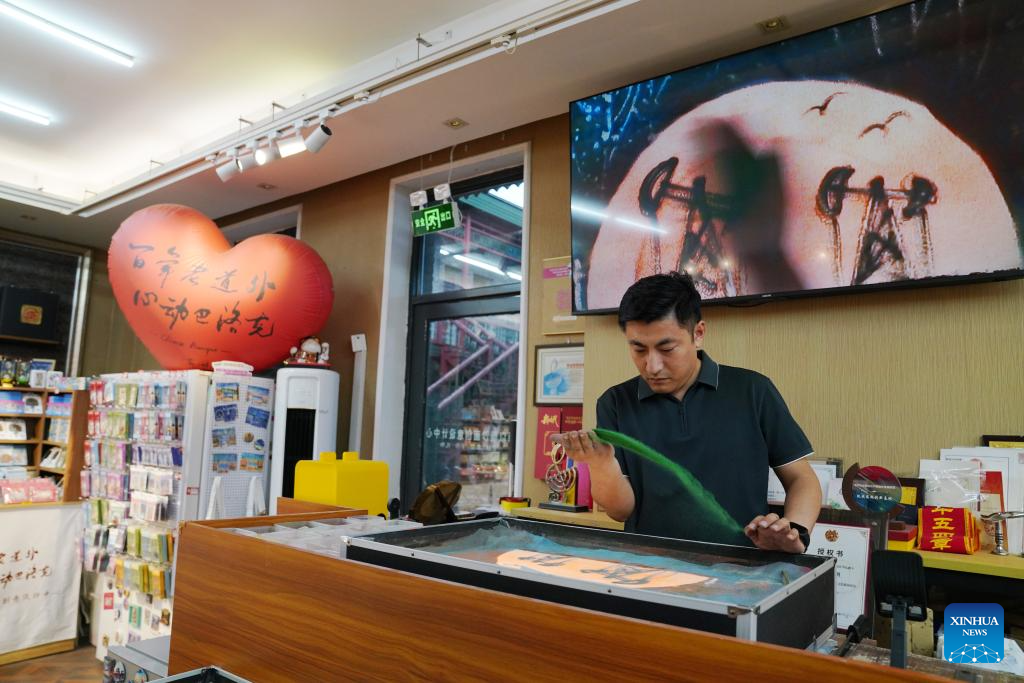An artist makes a sand painting for customers at a sand painting creative design center of the Chinese Baroque Historic and Cultural Block in Harbin, northeast China's Heilongjiang Province, on Aug. 5, 2025. While much of China swelters under scorching summer heat, Harbin, capital of northeast China's Heilongjiang Province, is drawing visitors with a refreshing contrast, offering a chilly escape fueled by its pleasantly cool climate.