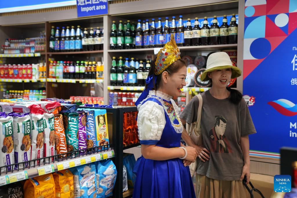 A tourist selects products at a Russian goods store on the Central Street in Harbin, northeast China's Heilongjiang Province, on Aug. 5, 2025. While much of China swelters under scorching summer heat, Harbin, capital of northeast China's Heilongjiang Province, is drawing visitors with a refreshing contrast, offering a chilly escape fueled by its pleasantly cool climate.
