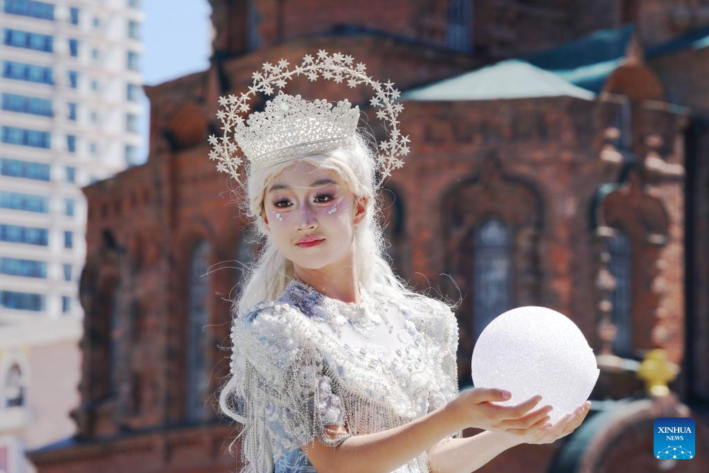 A dressed-up tourist poses for photos at an architecture art square in Harbin, northeast China's Heilongjiang Province, on July 30, 2025. While much of China swelters under scorching summer heat, Harbin, capital of northeast China's Heilongjiang Province, is drawing visitors with a refreshing contrast, offering a chilly escape fueled by its pleasantly cool climate.