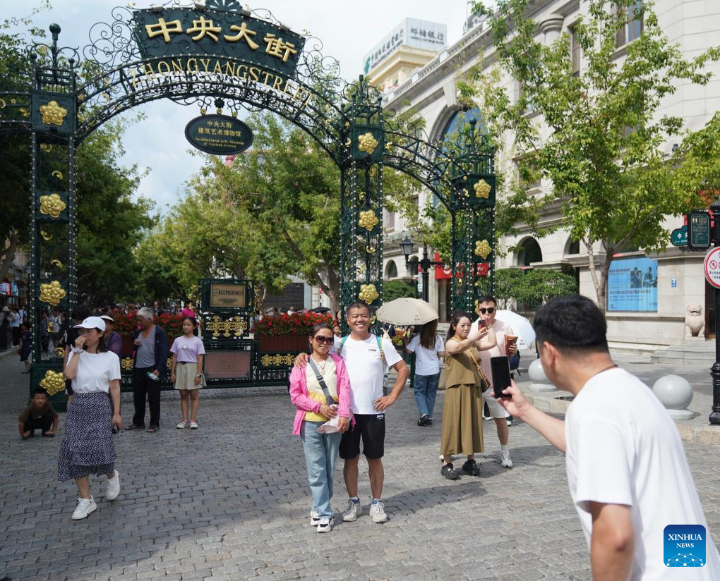 Tourists take photos on the Central Street in Harbin, northeast China's Heilongjiang Province, on Aug. 5, 2025. While much of China swelters under scorching summer heat, Harbin, capital of northeast China's Heilongjiang Province, is drawing visitors with a refreshing contrast, offering a chilly escape fueled by its pleasantly cool climate.