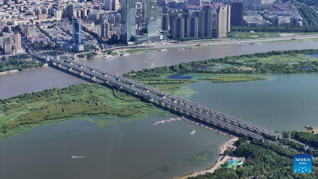 An aerial drone photo taken on July 30, 2025 shows a view of Yangmingtan Bridge in Harbin, northeast China's Heilongjiang Province. While much of China swelters under scorching summer heat, Harbin, capital of northeast China's Heilongjiang Province, is drawing visitors with a refreshing contrast, offering a chilly escape fueled by its pleasantly cool climate.