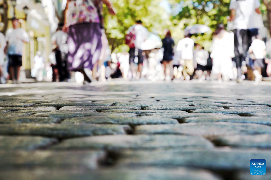 This photo taken on July 30, 2025 shows the stone bricks of the Central Street in Harbin, northeast China's Heilongjiang Province. While much of China swelters under scorching summer heat, Harbin, capital of northeast China's Heilongjiang Province, is drawing visitors with a refreshing contrast, offering a chilly escape fueled by its pleasantly cool climate.