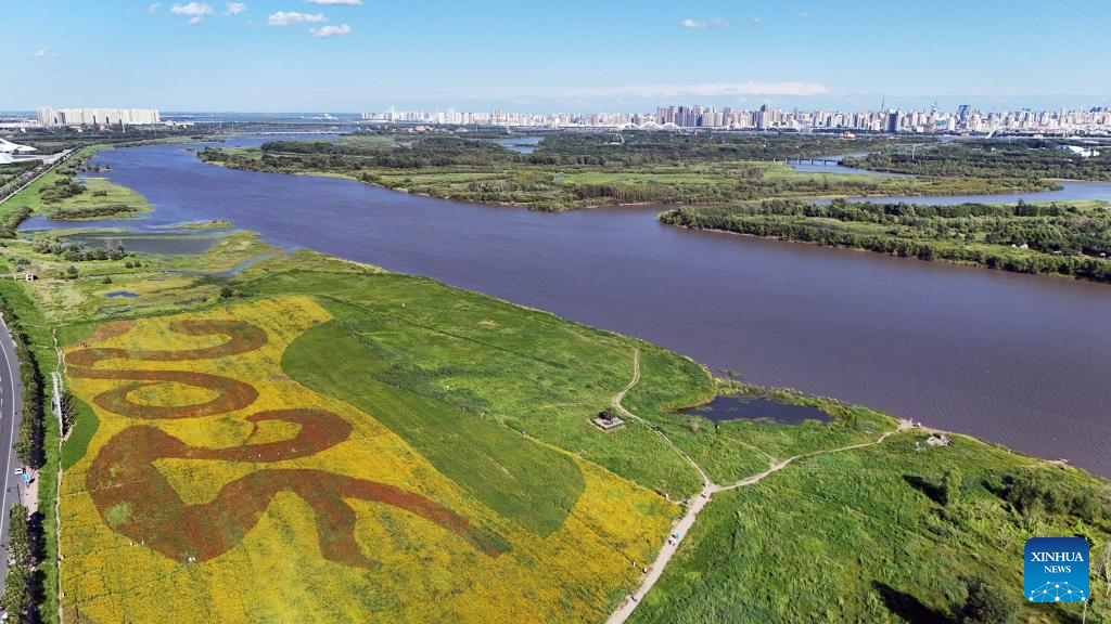 An aerial drone photo taken on July 30, 2025 shows a flower landscape along the Songhua River in Harbin, northeast China's Heilongjiang Province. While much of China swelters under scorching summer heat, Harbin, capital of northeast China's Heilongjiang Province, is drawing visitors with a refreshing contrast, offering a chilly escape fueled by its pleasantly cool climate.