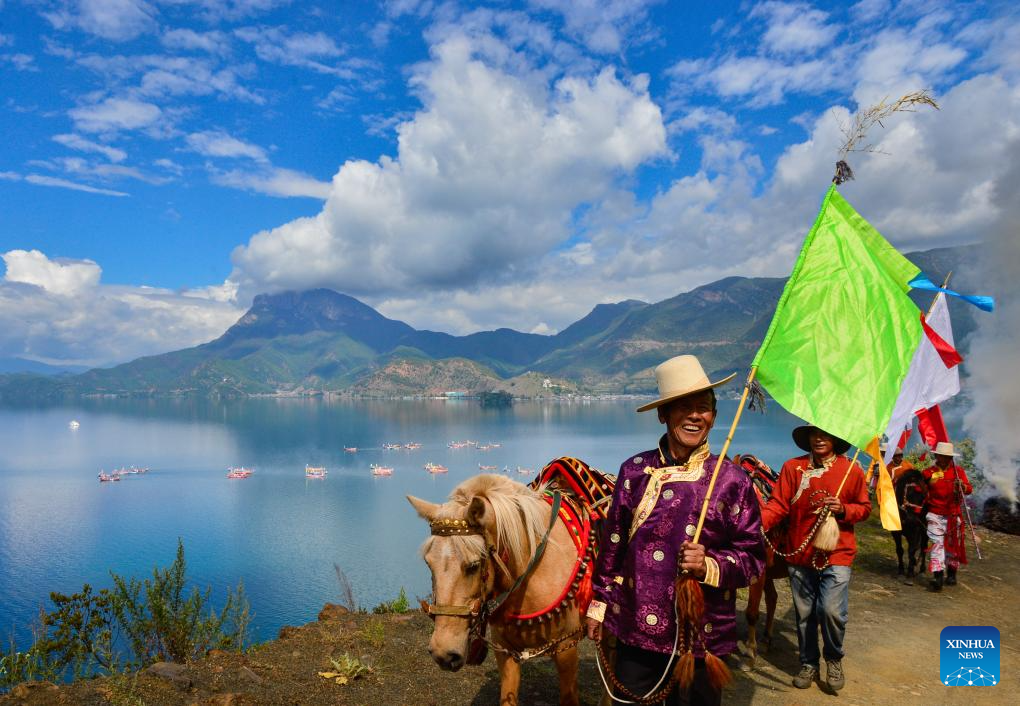 Local people herd horses while circling the mountain in Yanyuan County of Liangshan Yi Autonomous Prefecture, southwest China's Sichuan Province, Sept. 16, 2025. The first mountain and lake circling festival of Lugu Lake kicked off at Liangshan Yi Autonomous Prefecture on Tuesday. Mountain and lake circling is an important folk custom of the Mosuo people living near Lugu Lake. Starting this year, Liangshan Prefecture has officially designated the 25th day of the seventh lunar month as the mountain and lake circling festival, making it a local statutory holiday. Residents of Yanyuan and Muli counties can enjoy a one-day exclusive holiday. (Xinhua/Jiang Hongjing)
