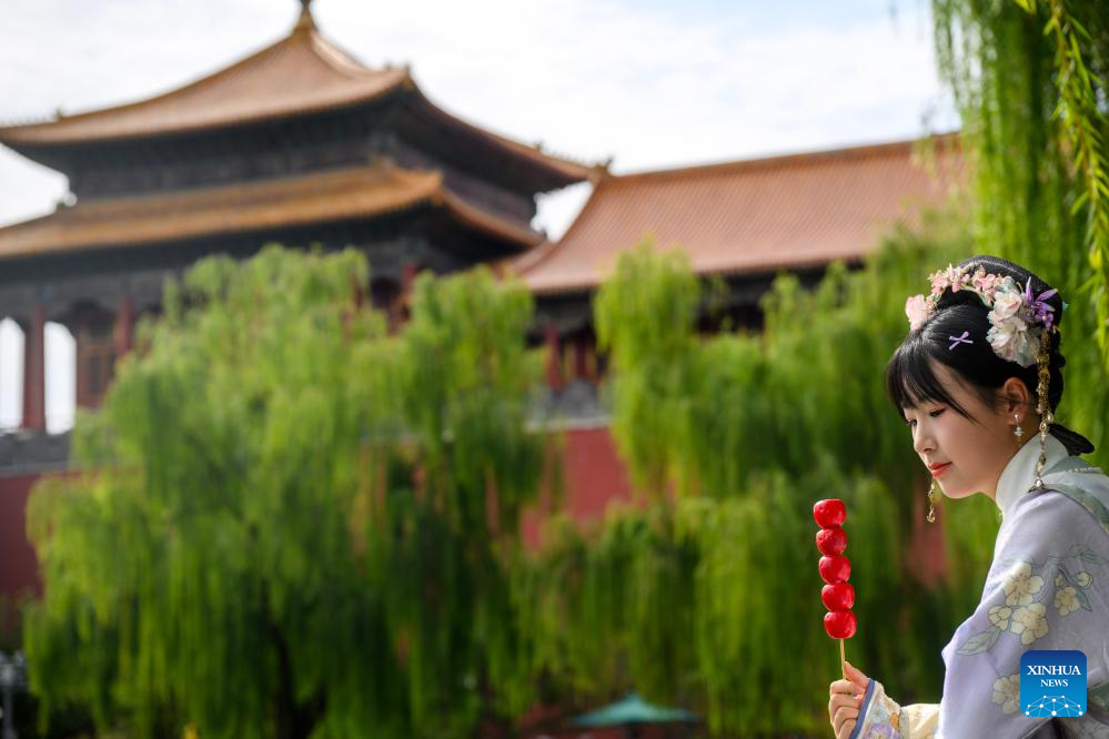 A tourist in traditional costumes is pictured outside the Palace Museum in Beijing, capital of China, Oct. 2, 2025. This year marks the 100th anniversary of the founding of China's Palace Museum, also known as the Forbidden City.(Xinhua/Jin Liangkuai)