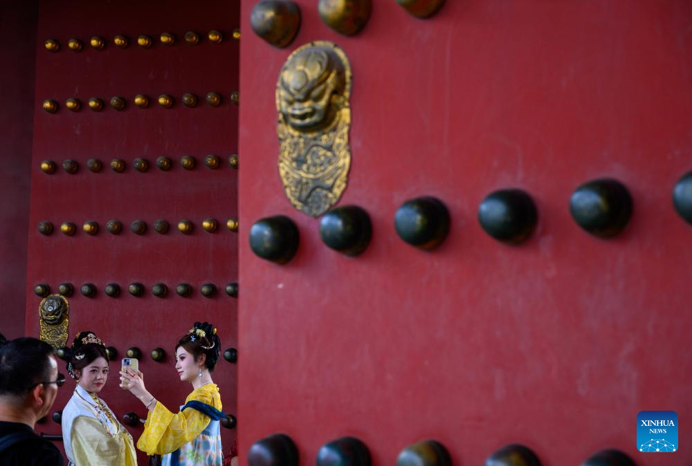 Tourists in traditional costumes take pictures at the Palace Museum in Beijing, capital of China, Oct. 2, 2025. This year marks the 100th anniversary of the founding of China's Palace Museum, also known as the Forbidden City.(Xinhua/Jin Liangkuai)