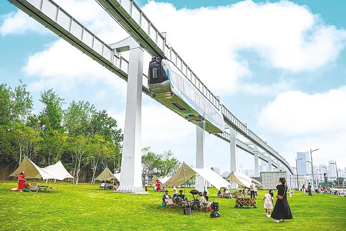 Photo shows people are camping under the skyrail inOptics Valley, which set a new record with24,400 daily passengertrips on Oct. 4,2025,surpassing its previous peak of 23,800 on May 3 this year. (Photo provided to Hubei Daily)