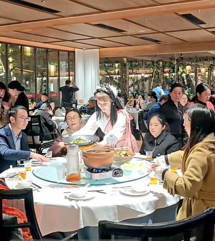 Performers occasionally walk throughout the courtyard to interact with diners. One restaurant-goer spotted an actor roleplaying as “Ke Zhen’e”, a character depicted as blind in the novel, scrolling through his phone in the corridor. The actor slowly turned, leaning on his demon-subduing staff, and with his eyes tightly closed, he delivered the line with utter seriousness: “Follow my lead!” The striking contrast between his demeanor and words drew hearty laughter from all present.