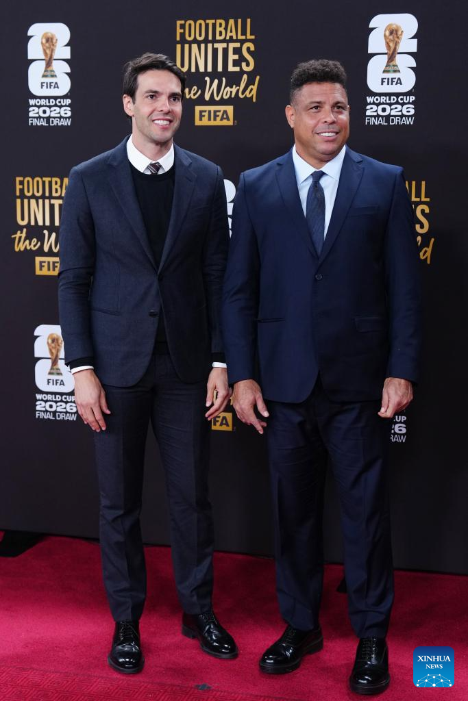 Former Brazilian footballers Kaka (L) and Ronaldo Nazario arrive on the red carpet ahead of the FIFA World Cup 2026 Final Draw at the Kennedy Center in Washington D.C., the United States, Dec. 5, 2025. (Xinhua/Jia Haocheng)