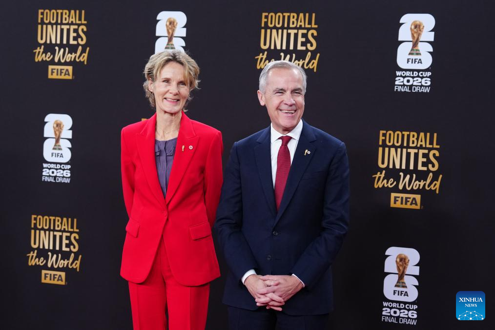 Canada's Prime Minister Mark Carney (R) and his wife Diana Fox Carney arrive on the red carpet ahead of the FIFA World Cup 2026 Final Draw at the Kennedy Center in Washington D.C., the United States, Dec. 5, 2025. (Xinhua/Jia Haocheng)
