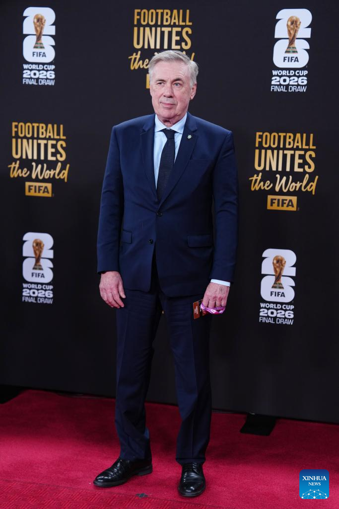 Carlo Ancelotti, head coach of the Brazilian national soccer team arrives on the red carpet ahead of the FIFA World Cup 2026 Final Draw at the Kennedy Center in Washington D.C., the United States, Dec. 5, 2025. (Xinhua/Jia Haocheng)