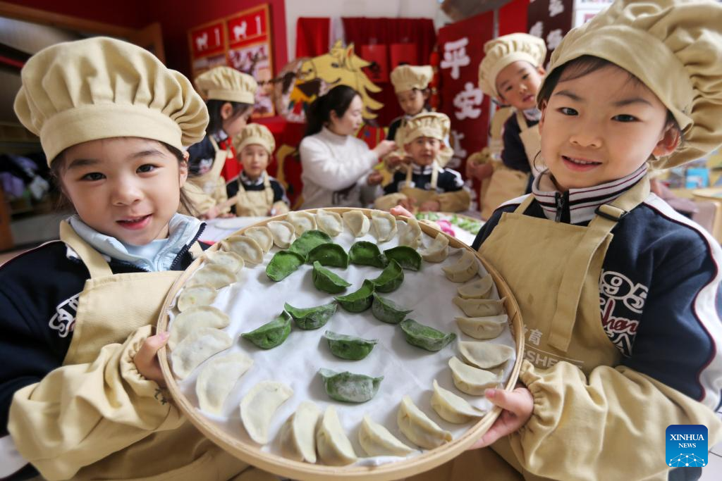 Children make dumplings at a kindergarten in Qianyuan Town of Deqing County in Huzhou City, east China's Zhejiang Province, Dec. 18, 2025. People all over the country held diverse events on Thursday to mark the Winter Solstice, which will fall on Dec. 21 this year.